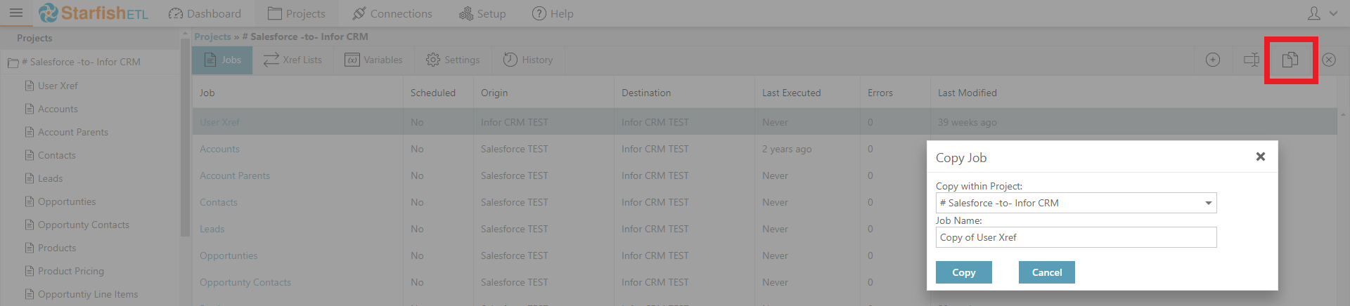 After selecting a job click on the copy button in the top right. This will copy all database connection settings, mappings, and schedules. The only setting that is (intentionally) not copied over is the Next Job for Job Chaining.