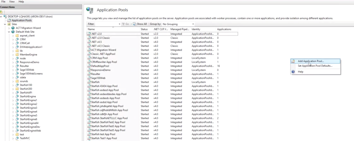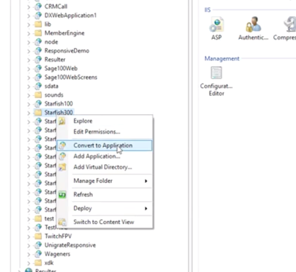 - In IIS, under Default Web Site, convert Starfish300 to an application. Enable 32-bit on the Application Pool